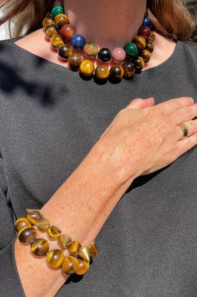 Yabba Dabba Doo!  We think Wilma Flintstone would have loved the Haute Energy Gum Ball Neck Hug!  The stones are the highlight here and finished in a toggle fashion with a simple knot and clear bead.  The Neck Hugs are meant to hug the neck in a choker style and can be layered or worn solo.  Lengths range from 16-18 inches and please make any size requests in the notes at check out.  Please note the Scarab influenced design is purposely shorter in length to allow for stacking with other Gumball Neck Hugs.